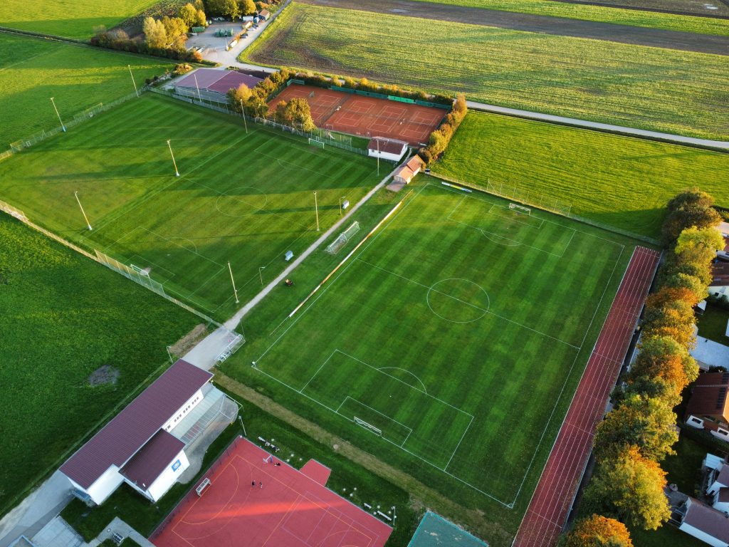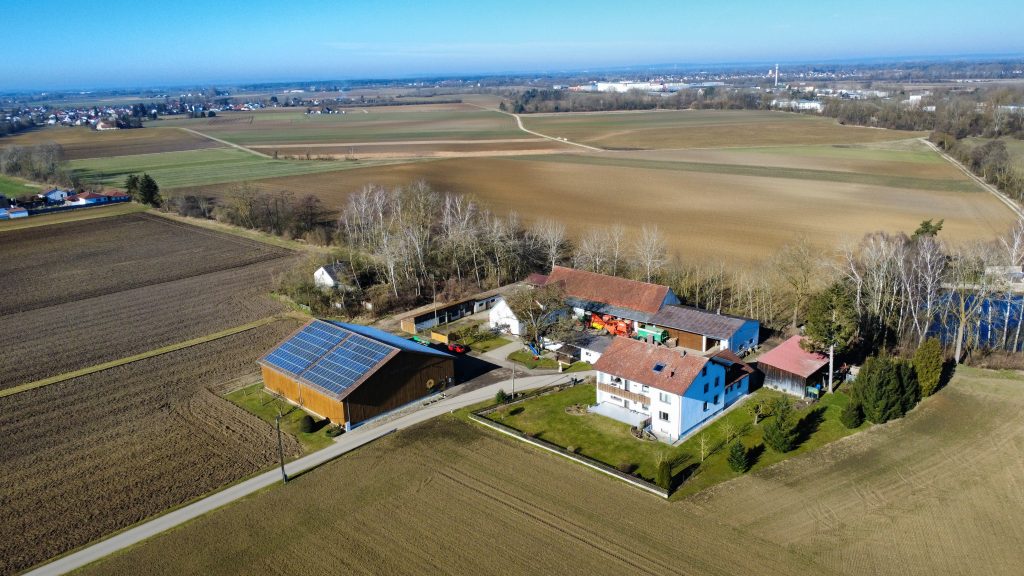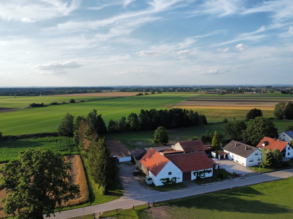 Panoramabild der Landschaft oder Luftaufnahmen des Eigenheims. Durch moderne Drohnenfotos & -Videos können Sie Ihre Umgebung aus der Luft betrachten.